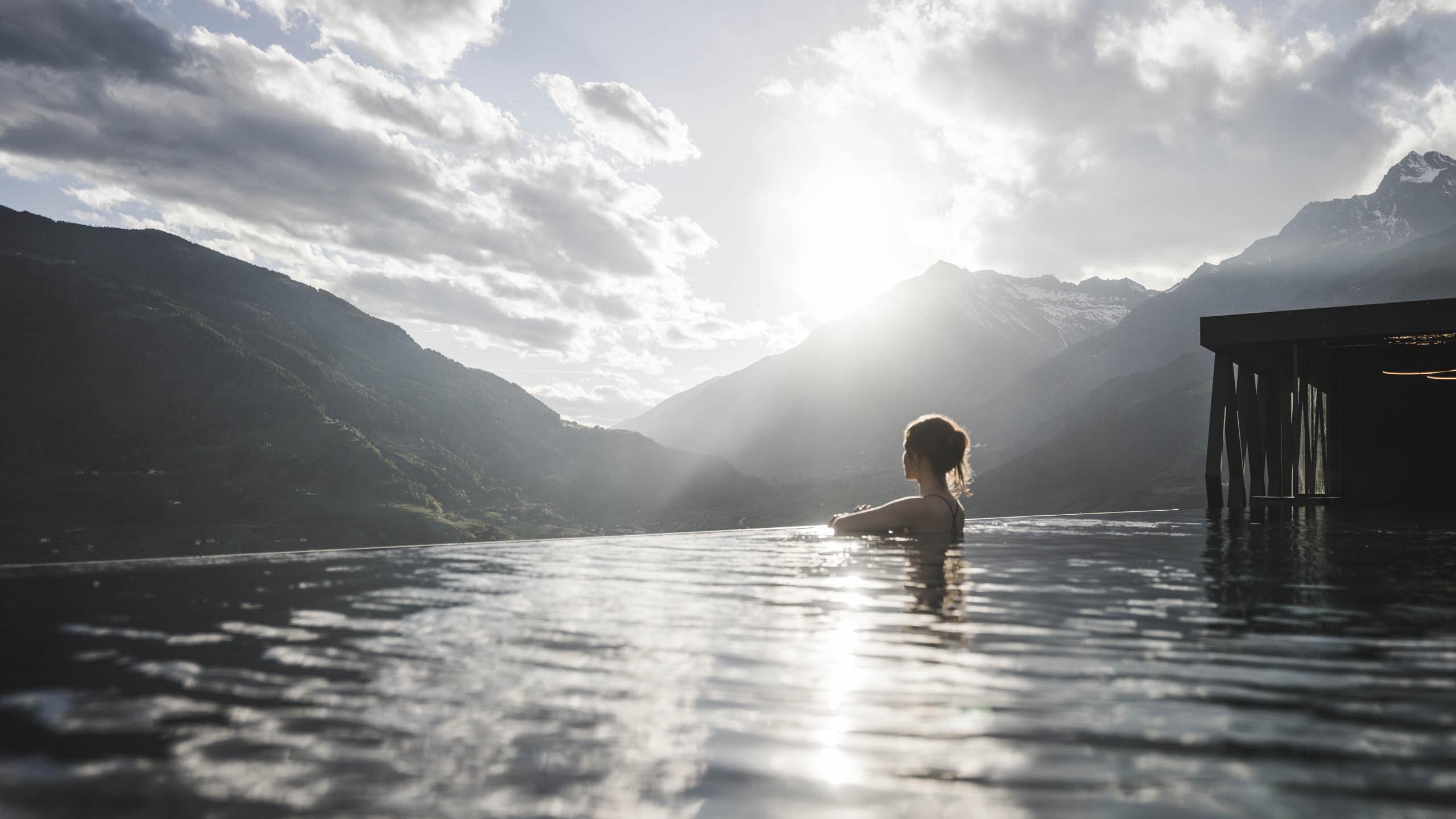 Tauchen Sie ein ins Wohlgefühl! Mit einem Sprung in den SomVita-Sky oder Garden Pool spüren Sie die Lebensgeister und genießen neben dem erfrischenden Nass vor allem eins: den herrlichen Blick über das Meraner Land.